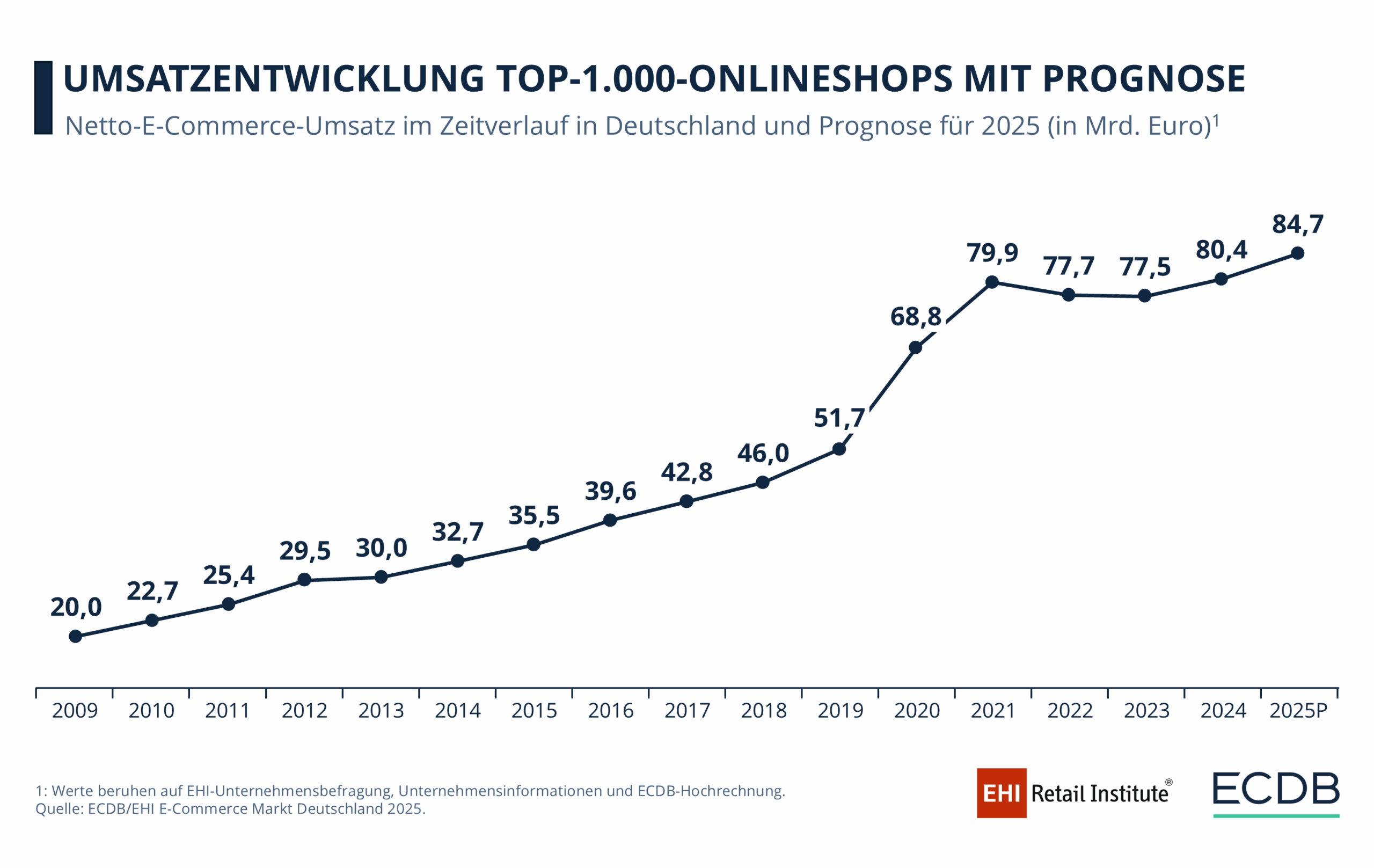 Das EHI Retail Institut hat zusammen mit der ECDB GmbH die 1.000 umsatzstärksten Onlineshops in Deutschland analysiert. Danach verzeichnet der Onlinehandel in Deutschland erstmals seit 2021 wieder ein Umsatzwachstum. Die 1.000 umsatzstärksten B2C-Onlineshops konnten im Geschäftsjahr 2024 ihren Netto-E-Commerce-Umsatz von 77,5 Mrd. Euro auf 80,4 Mrd. Euro steigern.