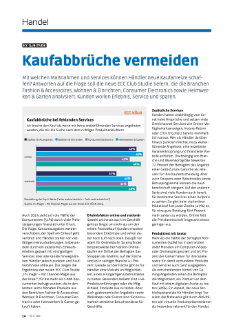 Auch 2024 sieht sich die Hälfte der Konsumenten (51%) durch viele Preis- steigerungen finanziell unter Druck. Die Folge: Konsumausgaben werden verschoben, der Spaß am Einkauf geht verloren und Händler stehen vor viel- fältigen Herausforderungen. Insbeson- dere durch ein exzellentes Einkaufs- erlebnis gepaart mit einzigartigen Services über alle Kanäle hinweg kön- nen Händler jedoch punkten und Kauf- hemmnisse abbauen. Das zeigen die Ergebnisse der neuen ECC Club Studie „It’s magic – mit Channel-Magie aus der Krise!“, für die mehr als 1.000 Kon- sumenten befragt wurden, die in den letzten sechs Monaten Produkte aus den Bereichen Fashion & Accessoires, Wohnen & Einrichten, Consumer Elec- tronics oder Heimwerken & Garten ge- kauft haben.