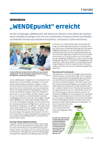 se inklusive Installationsarbeiten. „Wir haben heute schon über 100 konzessionierte Mitglieder, die im Bereich Photo- voltaik tätig sind und direkt am Konzept teilnehmen kön- nen“, erläutert Friedrich Sobol. Die letzte Stufe wendet sich an Jungunternehmerinnen und -unternehmer, die sich mit der Unterstützung von Electronic Partner unter der Fran- chisemarke „WENDEpunkt“ als Spezialisten für erneuerbare Energien selbstständig machen. Sie können ihren Kundin- nen und Kunden so kompetenten Service über die komplet- te Wertschöpfungskette anbieten. Zusätzlich spricht das Konzept an dieser Stelle bestehende „Einzelkämpfer“ an, die sich unter dem Dach einer