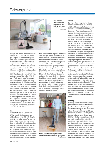 Der neue Akku-Saugwischer „Aqua Floorcleaner Cordless“ von Thomas erfüllt auf Knopfdruck gleich mehrere nützliche Funktionen: Hartböden, ins- besondere Parkett und Laminat, rei- nigt der flexible Nassreiniger, da er in einem einzigen Schritt saugt, feucht wischt und trocknet. Die Konzeption der Saugdüse gewährleistet eine be- sonders gute Kantenreinigung, da