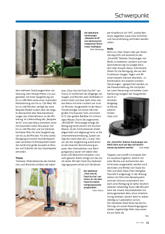 Treppen und schafft in kürzester Zeit ein sauberes Ergebnis. Seitlich mit einer Bürste zum Aufsammeln des Schmutzes ausgestattet, werden auch die Ecken und Winkel von Staub be- freit und dank Hepa-Filter Allergiker freundlich aufgesaugt. In der Absaug- station mit Drei-Liter-Beutelsystem wird der Schmutz automatisch ent- leert, eine Reinigung ist daher deutlich seltener notwendig. Rund 180 Minuten kann der smarte Haushaltshelfer mit leistungsstarkem Akku ohne Unterbre- chung arbeiten, danach kehrt er selbst- ständig zur Ladestation zurück.