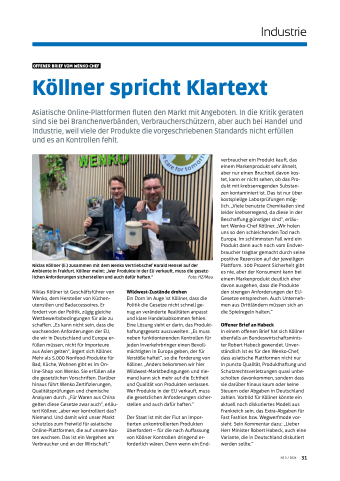 verbraucher ein Produkt kauft, das einem Markenprodukt sehr ähnelt, aber nur einen Bruchteil davon kos- tet, kann er nicht sehen, ob das Pro- dukt mit krebserregenden Substan- zen kontaminiert ist. Das ist nur über kostspielige Laborprüfungen mög- lich. „Viele benutzte Chemikalien sind leider krebserregend, da diese in der Beschaffung günstiger sind“, erläu- tert Wenko-Chef Köllner. „Wir holen uns so den schleichenden Tod nach Europa. Im schlimmsten Fall wird ein Produkt dann auch noch vom Endver- braucher tragbar gemacht durch seine positive Rezension auf der jeweiligen Plattform. 100 Prozent Sicherheit gibt es nie, aber der Konsument kann bei einem Markenprodukt deutlich eher davon ausgehen, dass die Produkte den strengen Anforderungen der EU- Gesetze entsprechen. Auch Unterneh- men aus Drittländern müssen sich an die Spielregeln halten.“