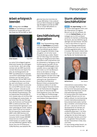 aus seiner Sicht erfolgreich getaner Arbeit kehrt Kastalio den Geislingern nun den Rücken. „Nach dem erfolg- reichsten Jahr der WMF-Geschichte und dem Abschluss des Skyline-Pro- jekts, das die Reorganisation der WMF-Geschäftsbereiche in separate und rechtlich selbständige Geschäfts- einheiten zum Ziel hatte, hat sich Oliver Kastalio, CEO der WMF GmbH und Mitglied des Executive Commit- tee, dazu entschlossen, zum Ende März von seinen Ämtern zurückzutre- ten und die WMF sowie die Groupe SEB zu verlassen“, verlautet aus der Unternehmenszentrale in Geislingen. Eine offizielle Pressemeldung zu die- ser bedeutenden Personalie gibt es nicht. Kastalio habe sich mit einer Mail an die Belegschaft verabschiedet. „Es war immer mein Ziel, das Führungs- team, die Strukturen und Prozesse bei WMF so weiterzuentwickeln, dass meine Anwesenheit irgendwann nicht mehr notwendig sein würde“, heißt es darin. Dieser Punkt sei nun erreicht. Die fünf operativen Gesellschaften (WMF GmbH, WMF Business Unit Consumer GmbH, Groupe SEB WMF Consumer GmbH, Groupe SEB WMF Shared Services GmbH, proHeq GmbH) werden nun jeweils von eige- nen Geschäftsführern geleitet. Martin Zouhar, Executive VP Professional Coffee Machines, wird weiterhin Mit-