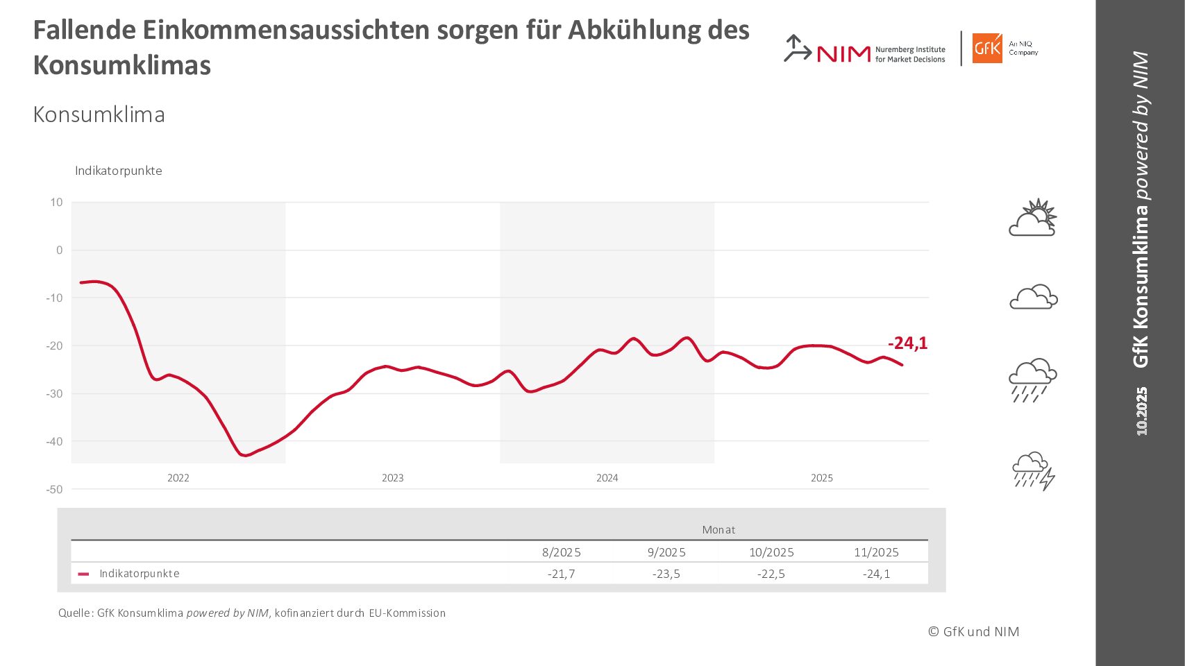 Die Sparneigung bleibt – wie bereits im Vormonat – nahezu unverändert. Ausgehend von den Entwicklungen, prognostiziert der Konsumklima-Indikator für November 2025 im Vergleich zum Vormonat einen Rückgang um 1,6 Zähler auf Minus 24,1 Punkte. Dies zeigen die aktuellen Ergebnisse des GfK Konsumklimas powered by NIM. „Im Oktober verliert die Einkommenserwartung knapp 13 Zähler und fällt auf 2,3 Punkte. Dies ist der niedrigste Wert seit März dieses Jahres, als -3,1 Punkte gemessen wurden,“ erklärt Rolf Bürkl, Head of Consumer Climate beim NIM.