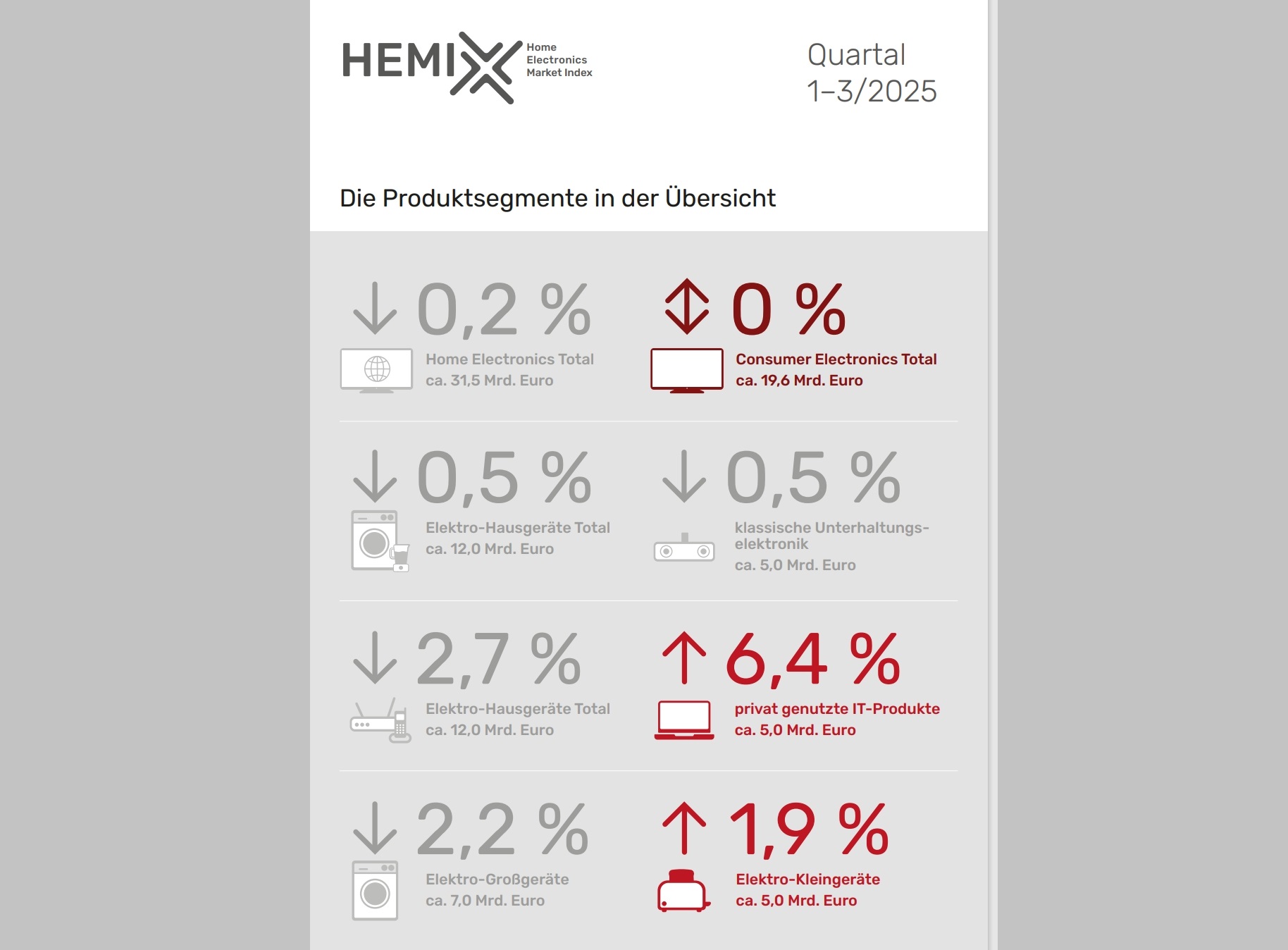 Bei den Elektro-Hausgeräten zeigte sich ein ausgeglichenes Bild. Während die Elektro-Kleingeräte ihren Umsatz um 1,9 Prozent auf rund 5,1 Mrd. Euro steigerten, verzeichneten die Elektro-Großgeräte ein leichtes Minus von 2,2 Prozent auf rund 6,8 Mrd. Euro. Besonders gefragt blieben Produkte, die Energieeffizienz und Komfort miteinander verbinden.