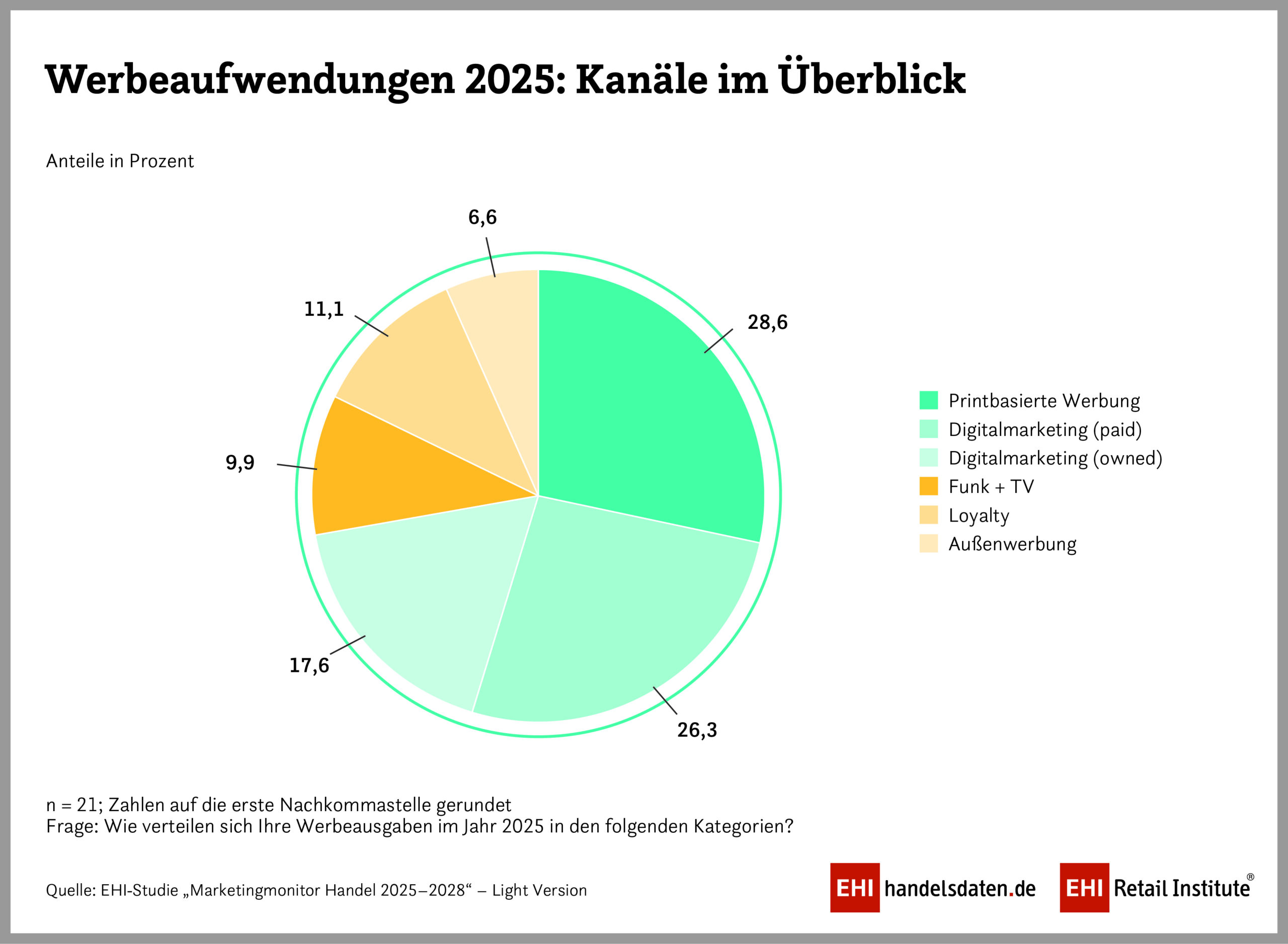 Die Studie „Marketingmonitor 2025 – 2028“ basiert auf einer Erhebung von Führungskräften aus dem Marketing von 21 deutschen Handelsunternehmen im Zeitraum von Juni – September 2025. Die Handelsunternehmen erwirtschafteten zusammen einen Umsatz von 35 Mrd. Euro des Gesamteinzelhandelsumsatzes, und betrieben rund 11.000 Filialen. Die Studie kann beim EHI kostenpflichtig erworben werden. Für EHI-Mitglieder ist sie kostenfrei.
