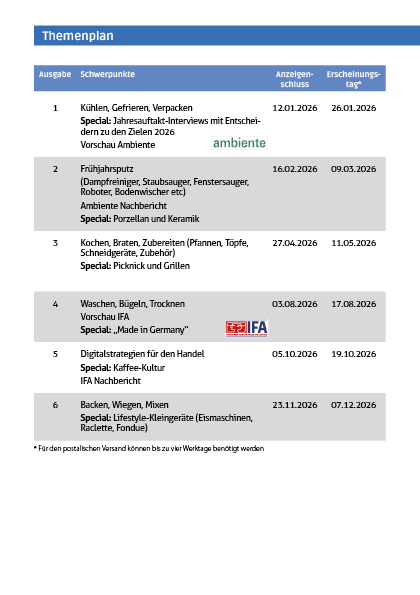 | 1 | Kühlen, Gefrieren, Verpacken Special: Jahresauftakt-Interviews mit Entscheidern zu den Zielen 2026 Vorschau Ambiente | 12.01.2026 | 26.01.2026 |